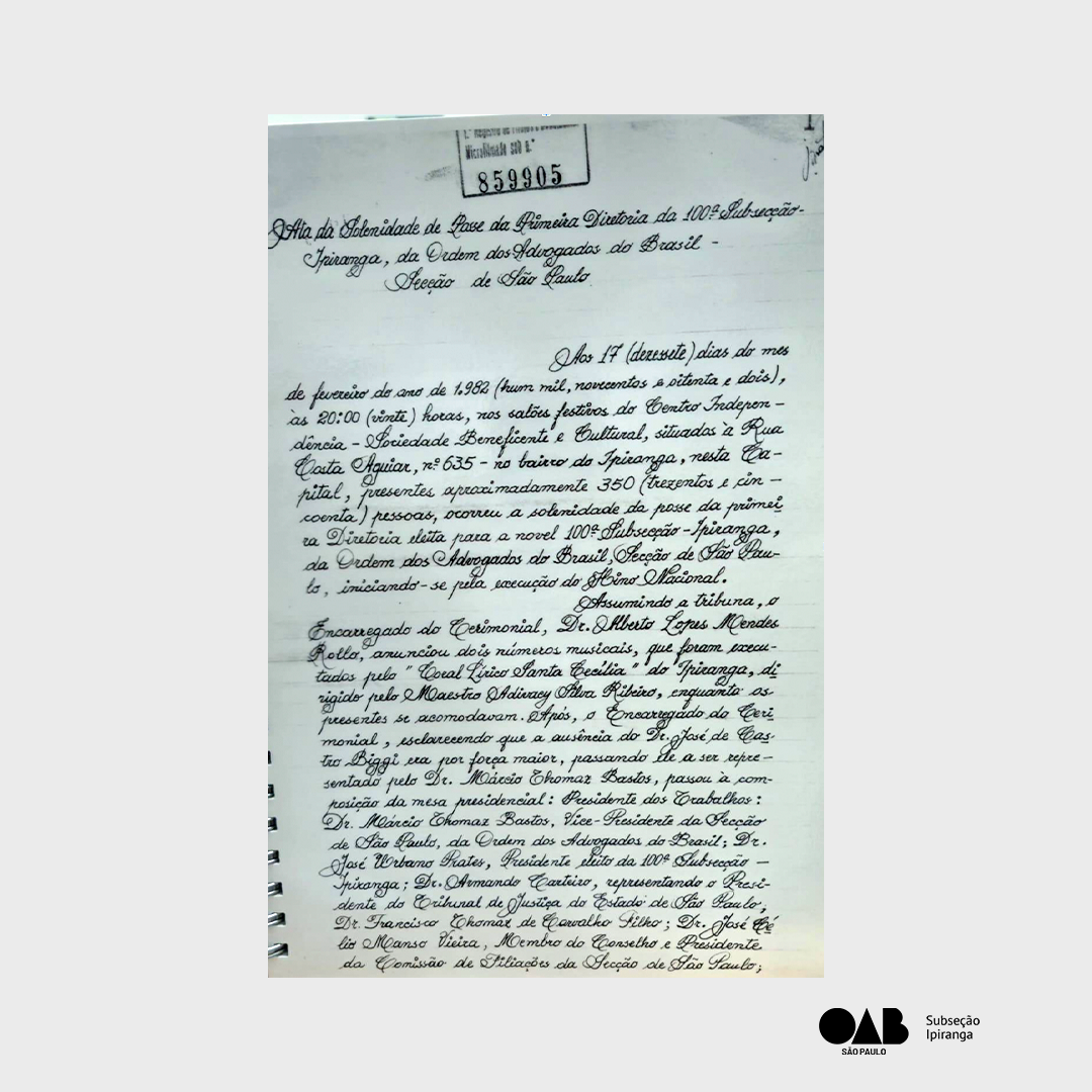 A história da OAB Subseção Ipiranga (a 100ª Subseção da OAB-SP) começa em 20 de outubro de 1981, nascendo da mobilização de advogados locais pela defesa da classe e da cidadania, atuando na expansão da advocacia, defesa de prerrogativas, cursos e suporte aos profissionais, sendo uma entidade com 40+ anos de luta pelo Direito e pela liberdade na região.